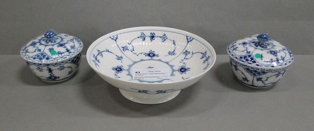 Kunglig Dansk, 3 delar Musselmalet, fat på fot nr. 1/18 D17cm samt 2st sockerskålar nr. 1/657, 1:a sortering