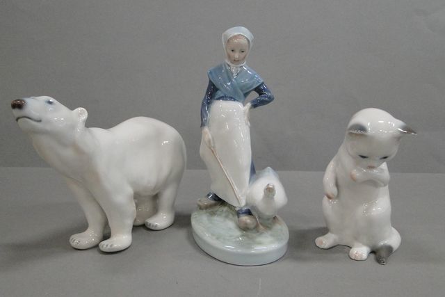 Kunglig Dansk 3st figuriner, katt H13cm, isbjörn H14cm samt kvinna med gås H19cm, samtliga 2:a sortering
