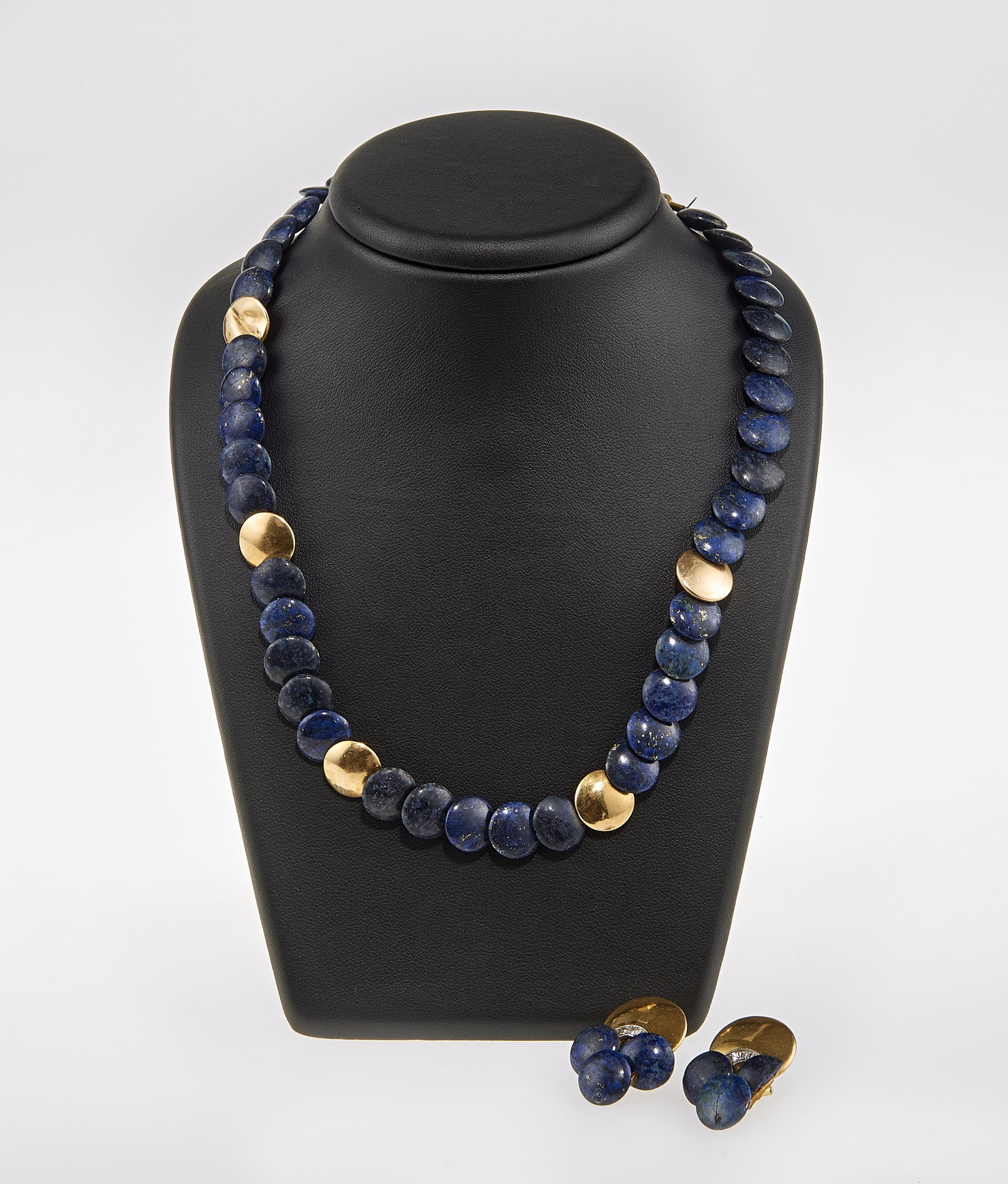 Gold 750, W 42 cm. Matching ears clips are attached in lapis lazuli and 750 gold.