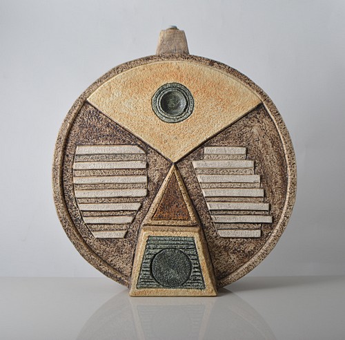 with abstract design to both sides, brown tan and green colourway, painted Troika Cornwall, England