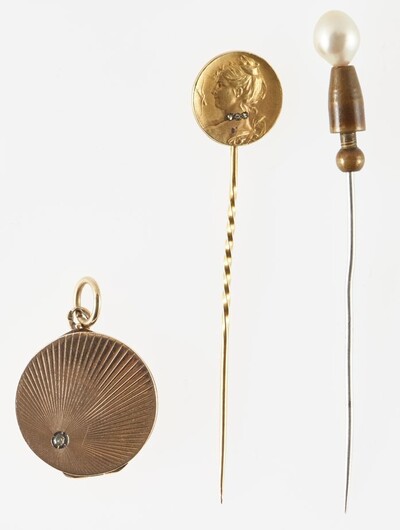 Lot of a hat pin and a round guilloche pendant set with a diamond rose
