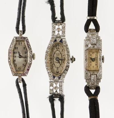 Lot of three Art Deco watches set with diamonds and diamond roses, one "made for Vacheron Constantin Geneva"