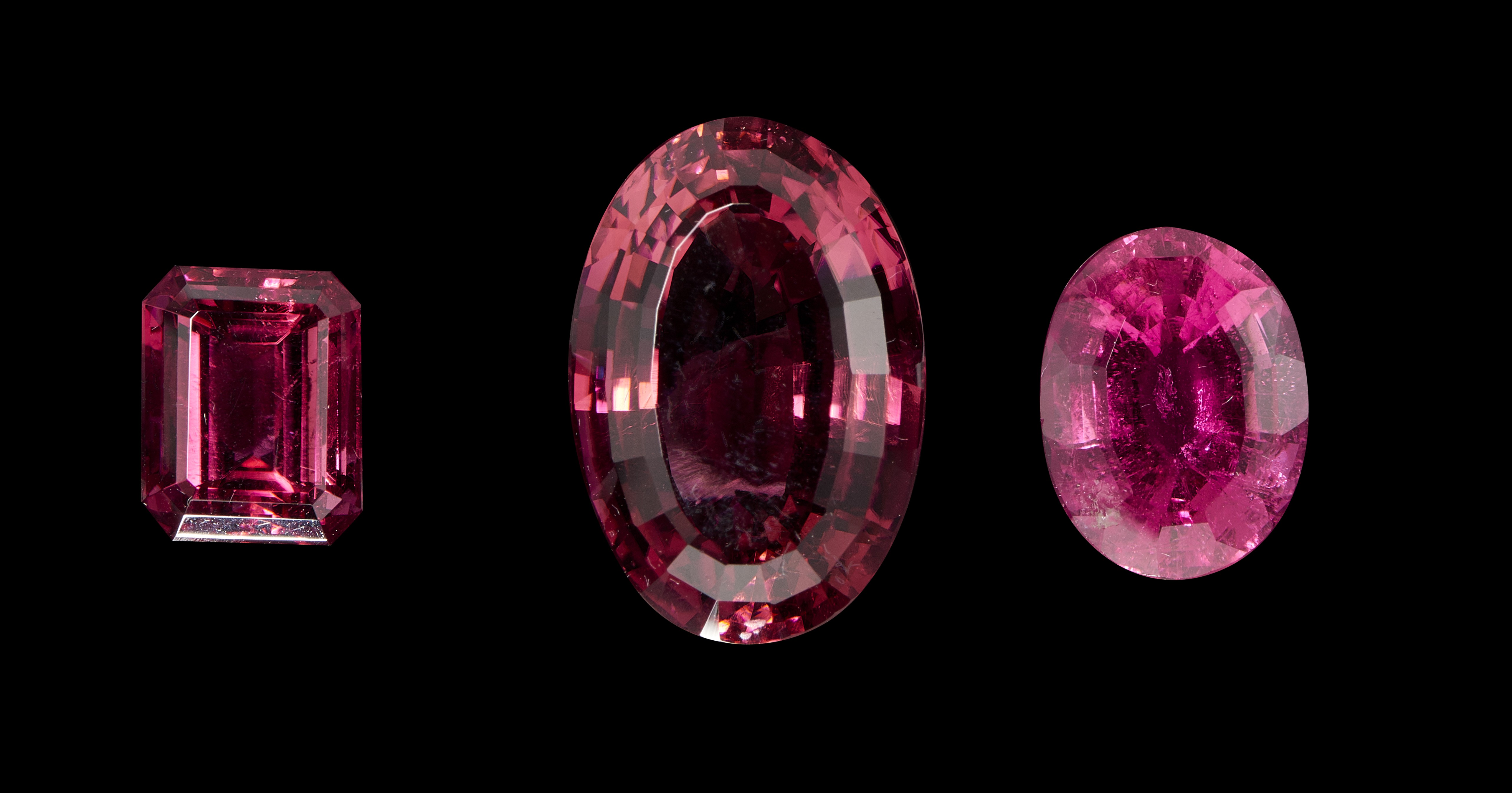 Lot of three pink tourmalines on paper, two oval cut (5.1 ct and 15.7 ct) and one emerald cut (3.85 ct)