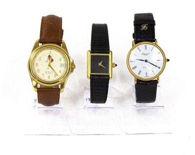 The one round and automatic, cream dial and golden hands, gold metal, D 33 mm, the second signed Léonard, quartz round, white dial and blue hands, gold metal, D 30 mm, and the last rectangular mechanical black dial and gold hands, 750 gold case, 17x2