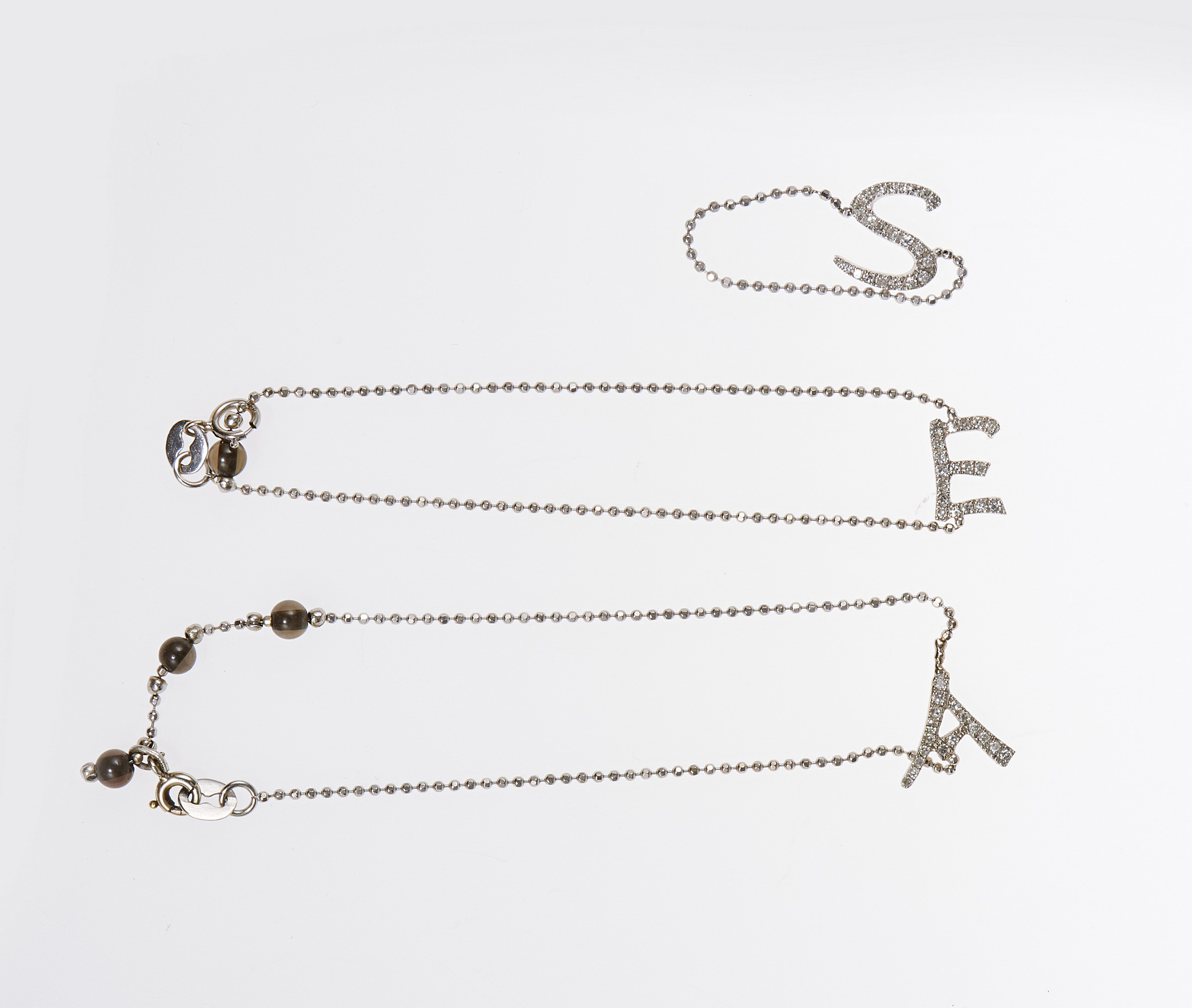 Lot of two bracelets and a ball-mesh ring each holding a letter set with diamonds