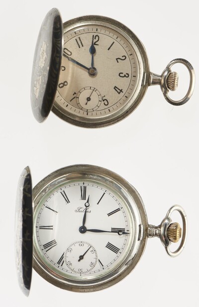 One Pallas with white dial, blue hands and black Roman numerals, seconds at 6 o'clock, silver, D 50 mm and the other with a gray dial, blue hands and black Arabic numerals, seconds at 6 o'clock