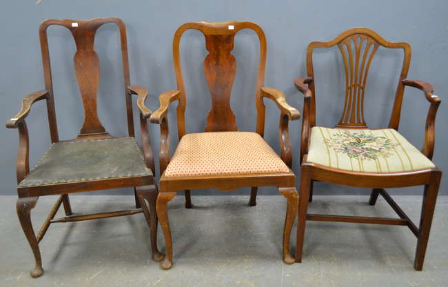 Mahogany armchair with drop in seat and two Queen Anne style open armchairs