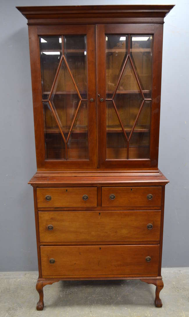 Mahogany bookcase chest, top with two bevelled glass doors, above base with two short over two long drawers