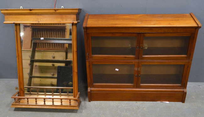 Mahogany glass fronted bookcase and a wall mirror with galleried shelf