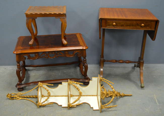 low coffee table, stool and a white and gold painted tiered corner wall hanging shelf
