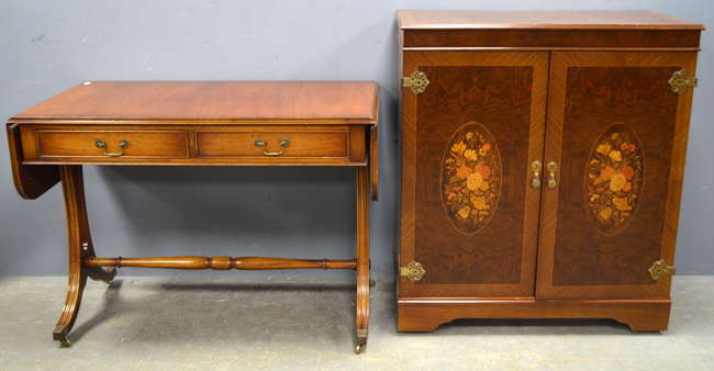 Mahogany sofa table with two drawers and drop flaps, and a modern two door tv cabinet