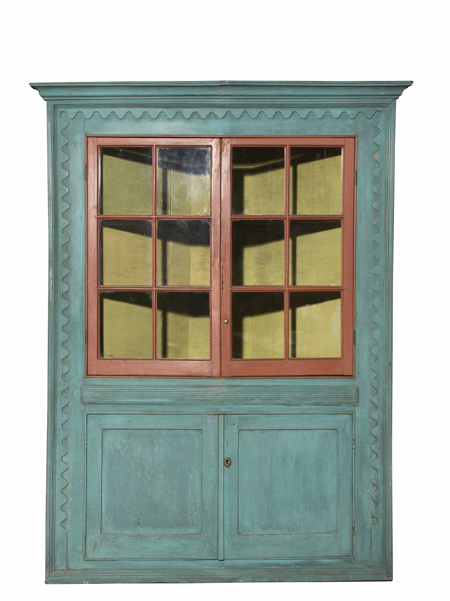 a one piece cupboard with (2) 6 pane glazed doors at the top over 2 flat paneled doors below having a scalloped molding surrounding it all, central peaked area runs down through the door closing line, 70" tall X 53 1/2" wide, E19thC construction typi