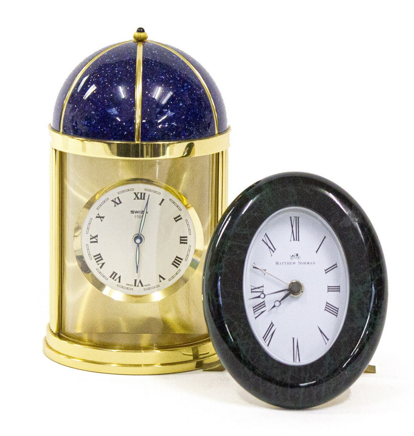 One oval with a white dial, black hands and Roman numerals, gold metal, H 10 cm, the other round with a gray dial, hands and black Roman numerals, silver metal, H 6.5 cm