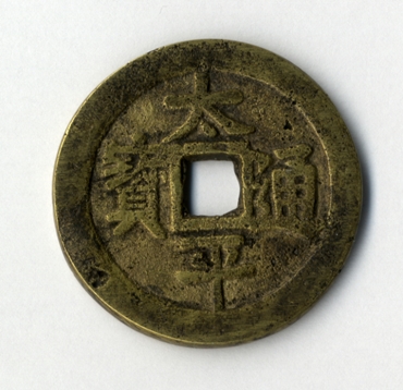 Dynastie Čching (1644 – 1911), emise mincí povstalců Tchaj-pching - Největší Mír (1851 – 1864), hodnota 10, revers: mincovna Bao Wu, mateřská neboli vzorová mince (čínsky: mu qian). Průměr 3,8 cm, 20,14 g