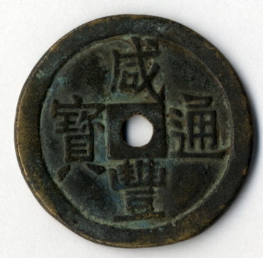 Dynastie Čching (1644 – 1911), epocha Sien-feng (Xian Feng) - Všeobecná hojnost císaře Wen-cunga (1851 – 1861), revers: hodnota 10 a ministerstvo financí, vyrývaná vzorová mince. Průměr 3,8 cm, 13,74 g