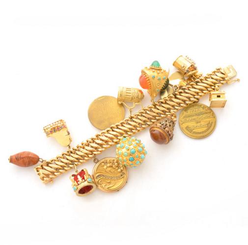 The 14k yellow gold fancy link measuring approximately 17.5 mm in width, completed by a tongue and groove clasp with figure eight safety, forming a 7 inch bracelet and featuring sixteen charms as follows: an 18k yellow gold house; a metal PGA of Amer
