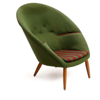 "Oda-Chair”. Easy chair with oak legs and teak armrests, upholstered with green striped wool