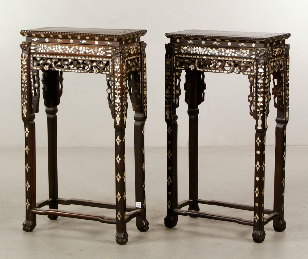 Near pair of 18th/19th century Chinese stands, carved wood with mother of pearl inlay