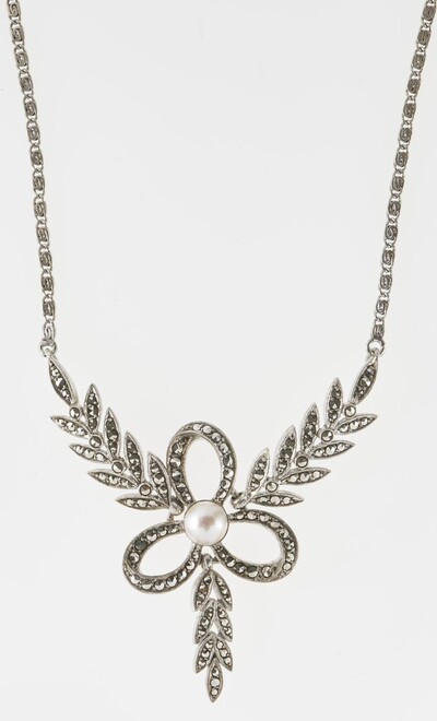 Necklace with knots motif and garlands set with marcasites and centered with a pearl