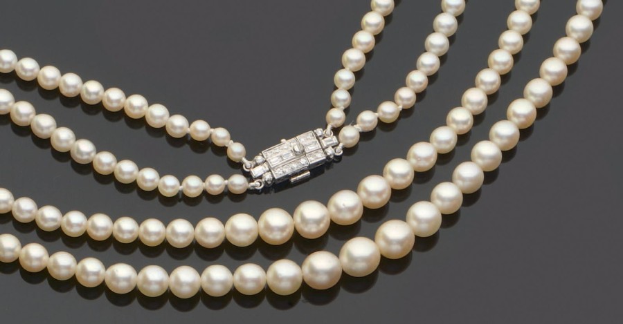 Necklace with two rows of beautiful pearls falling, pretty clasp in white gold, 750 MM