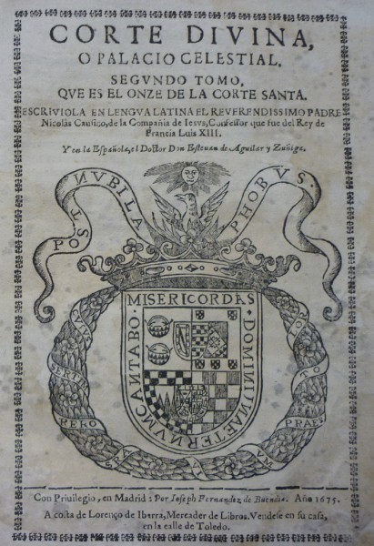 Primero y segundo tomo que son diez y onze de la Corte Santa. Segundo tomo que es el onze de la Corte Santa" M.: Ioseph Fernández de Buendía, 1675. 4º menor, perg. 2 vols. Escudo grabado en port. Vol. I, falta la esq. sup. ext. en las 4 primeras h.,