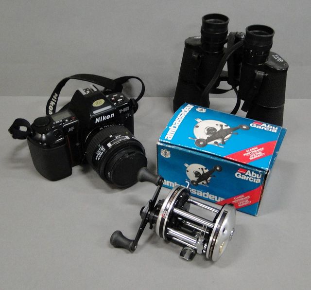 Nikon kamera F-801/AF med objektiv Nikkor 1:3.3-4.5 35-70mm, Bristol kikare 7x50 samt ABU Garcia fiskrulle Ambassadeur 6500C, för kamerans funktion ansvaras ej