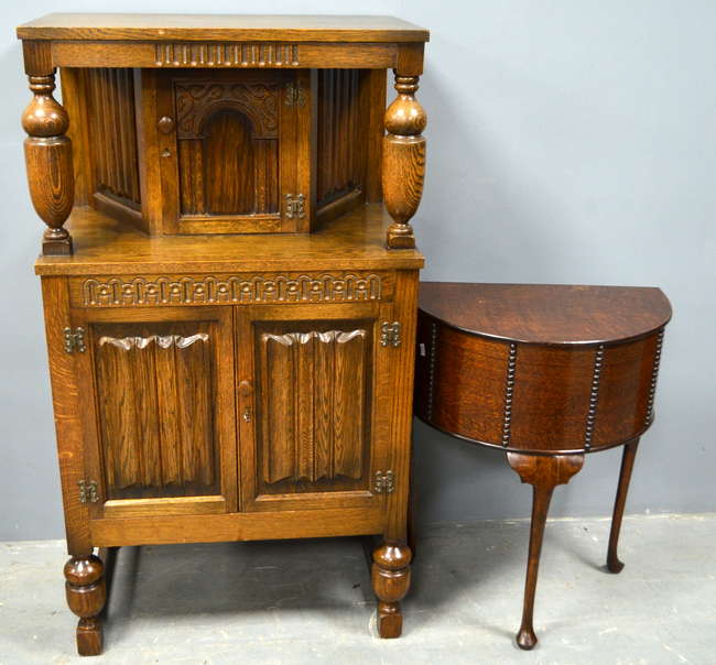 Oak court cupboard and a oak demi-lune workbox