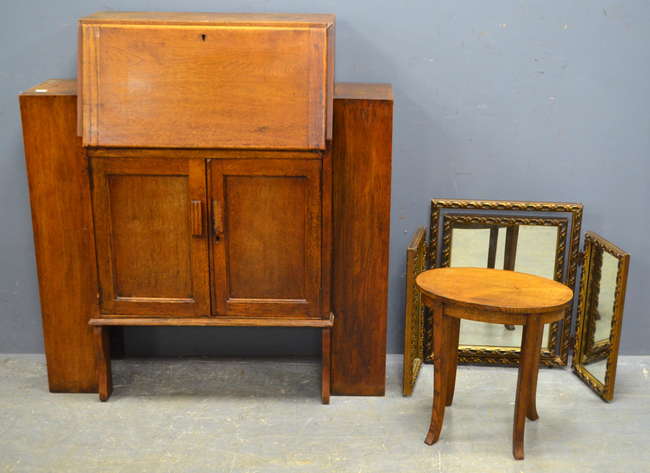 Oak drop flap cabinet, oak oval ocassional table and two triptych dressing table mirrors