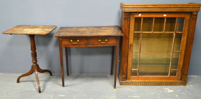 Oak side table with two drawers, oak tilt top table and an oak display cabinet