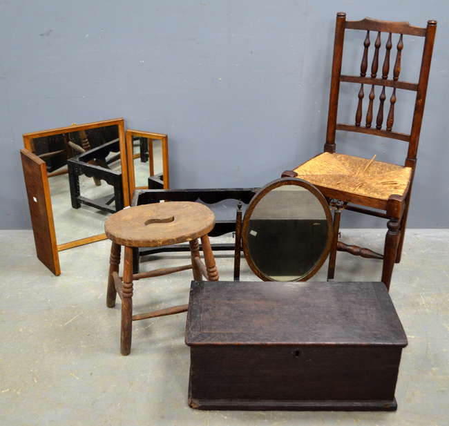 Oak single chair, oak stained box, stool, stand and two mirrors