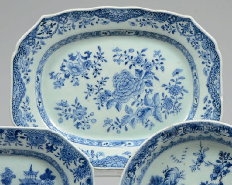 Octagonal porcelain dish of the Company Indies decorated in underglaze cobalt blue floral bouquets