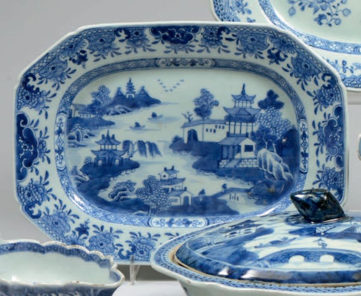 Octagonal porcelain dish of the Company Indies decorated in underglaze cobalt blue of a lake landscape.