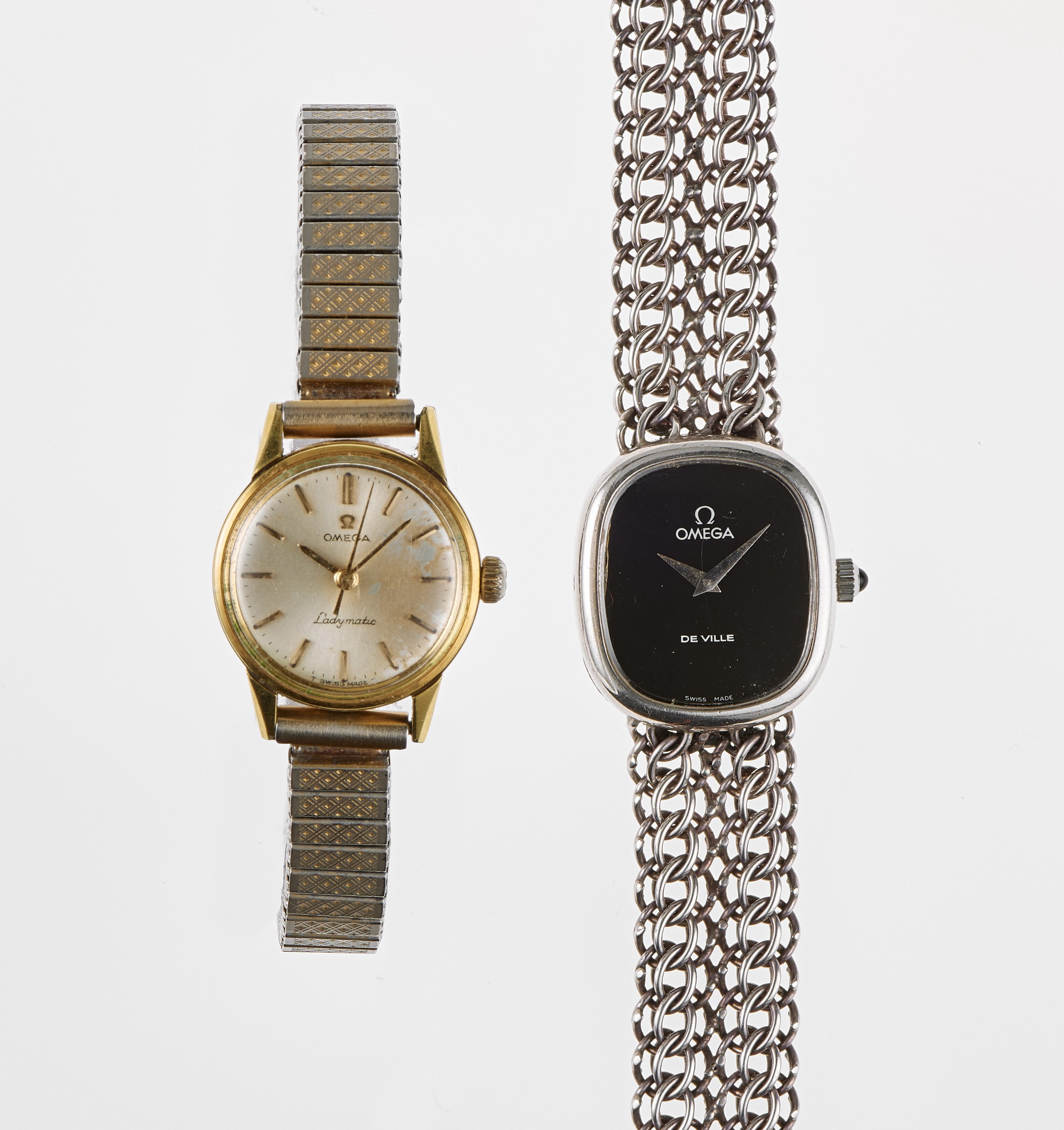 Black dial, silver hands, winding set with onyx, 925 silver, 26x23 mm, W 18,5 cm. A mechanical Omega round wristwatch with gray dial, golden stick indexes and hands, metal and gold metal, D 22 mm.