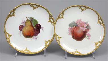 Reliefierter Rocaillenrand, goldbronziert. Im Spiegel bunt gemalter Obstzweig mit Kirschen, Birne und Pfirsich. Szeptermarke mit rotem Reichsapfel über KPM, Berlin, 1871-1945. 1. Wahl. D. 19 cm