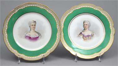 Gewellte Fahne mit grünem Fond und Goldstafffage. Im Spiegel bunt gemalte Darstellungen der "Marie Leszczynska" und "Mme. Dubarry", so rückseitig betitelt. Rote, Sèvres imitierende Marke, 19. Jh. D. 24 cm.