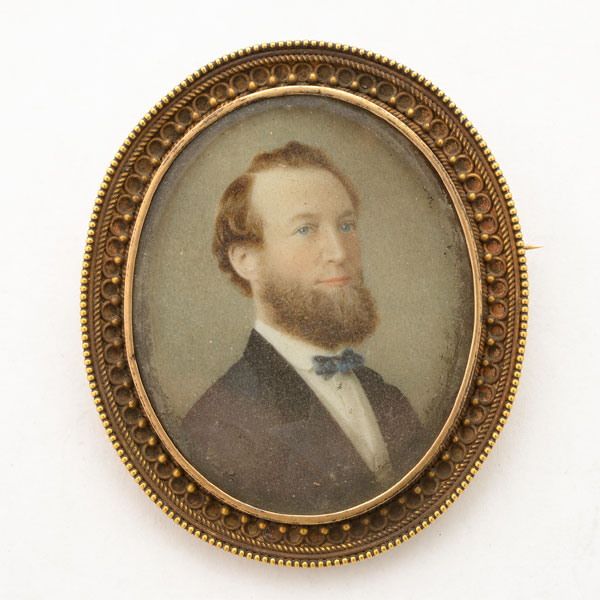 Featuring a painted portrait miniature measuring approximately 48 mm, depicting a gentleman, framed in an 18k yellow gold pendant brooch mounting.
