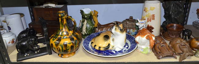 Pair of carved ebony Elephant bookend, oriental carvings, boxes and decorative china.