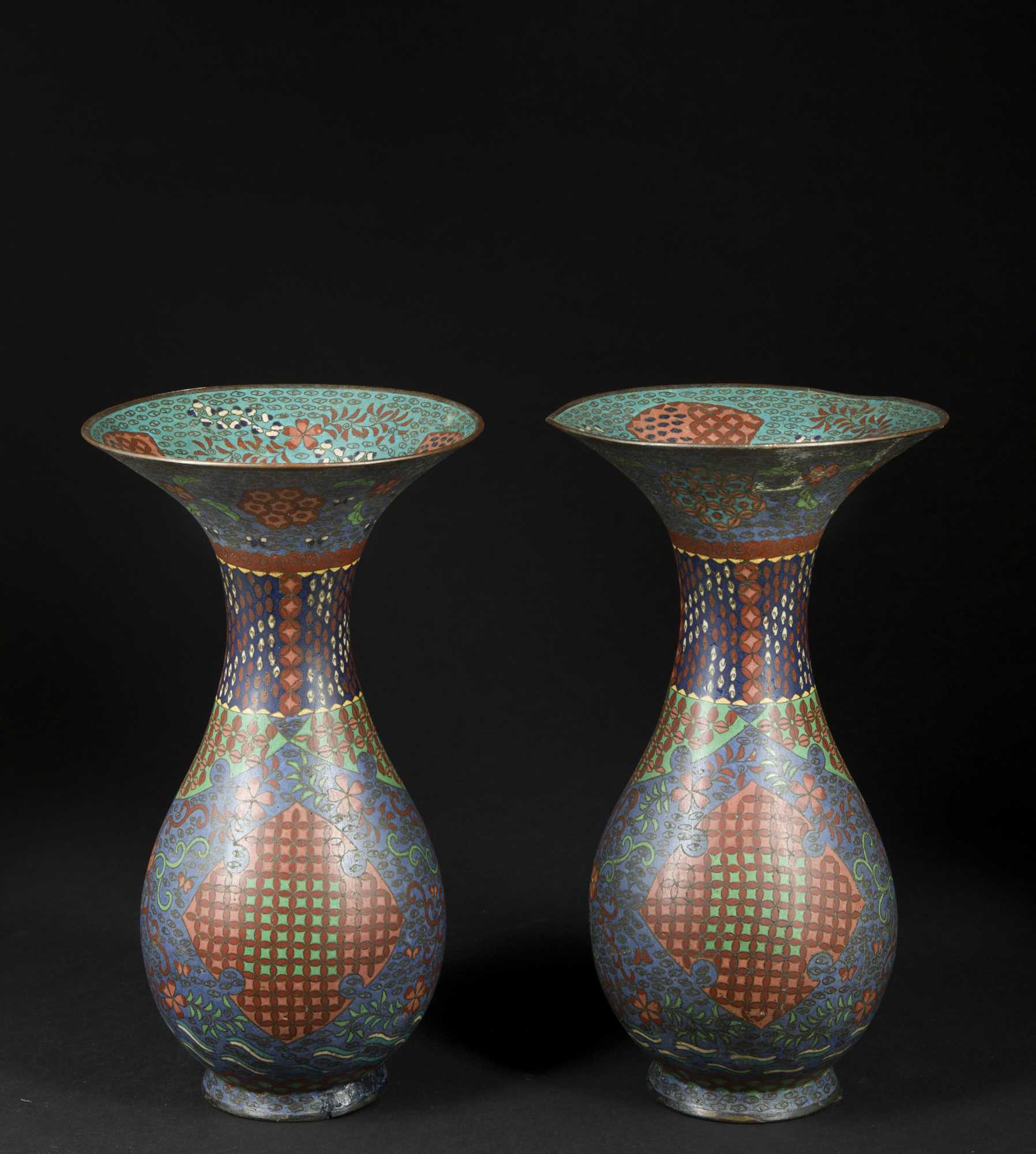 having a bulbous body with a strong flaring top rim standing 12 1/4" tall with multicolored geometric Chinese designs on a green ground, 19th/20thC, small repair under one rim and on the rim base of the other