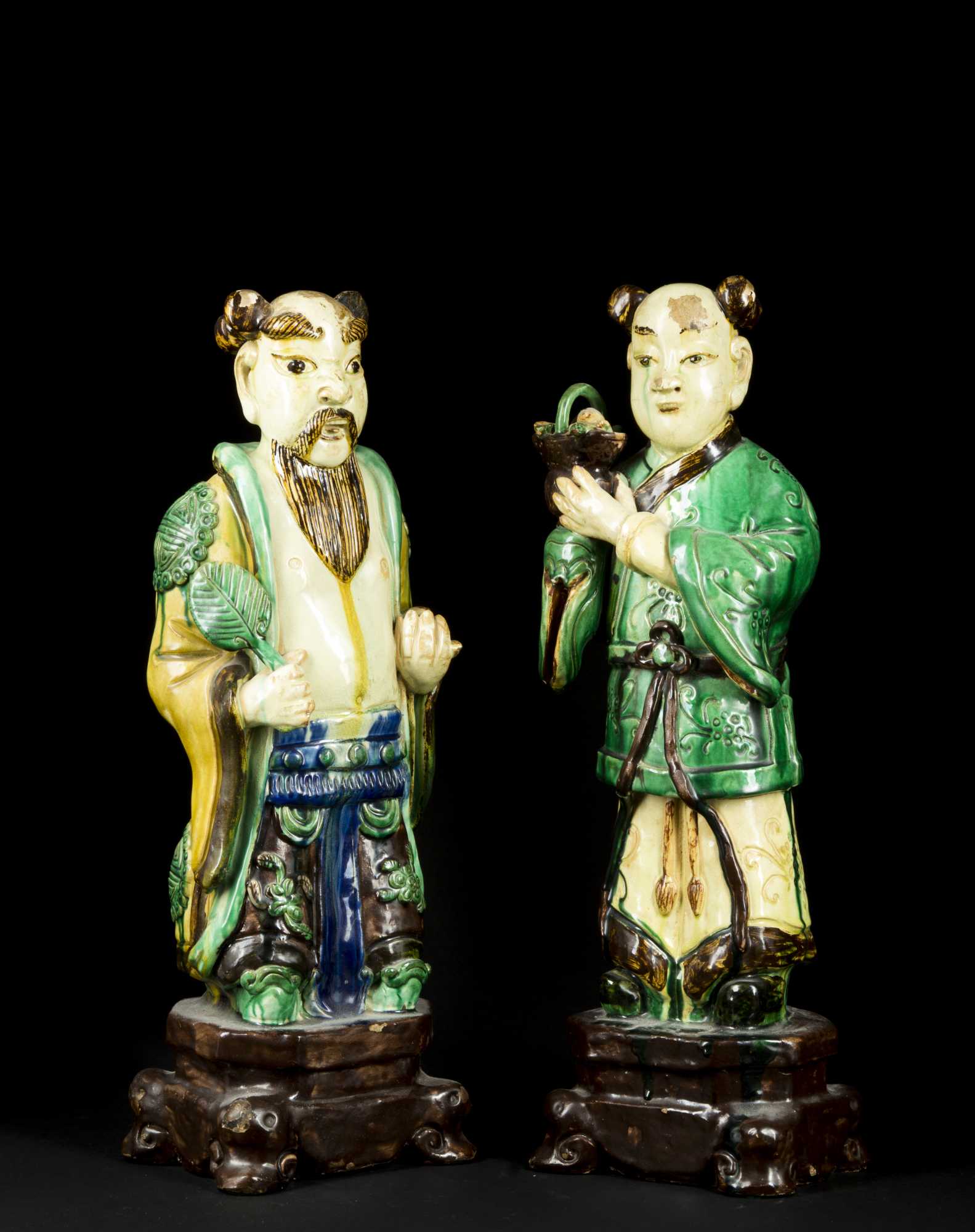 Depicting a male figure holding a leaf and fruit and the female figure holding a basket of fruit, each about 20" tall including the footed pedestal they are standing on, spinach green, brown and cream glaze with a few losses, an old paper label attac
