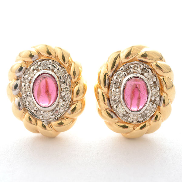 Each featuring one oval garnet cabochon measuring approximately 6.7 x 4.8 mm, surrounded by eight full-cut diamonds weighing a total of approximately 0.05 cttw., set in a ribbed 14k yellow gold mounting.