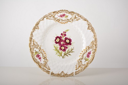 hand painted with puce flowers and gilt highlights, 24cm, and a Belleek menu holder.(3)