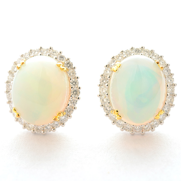 Each centering one oval opal cabochon measuring approximately 12.1 x 10 mm, surround by twenty-four full-cut diamonds weighing a total of approximately 0.40 cttw., set in a 14k white gold stud mounting.
