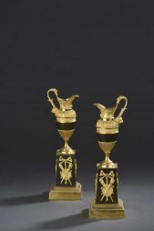 En bronze ciselé, patiné et doré, à décor d’aiguières, reposant sur une base pyramidale ornée de trophées