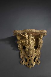 En bois sculpté et doré à décor de thermes et masques soutenant l’Enlèvement d’Europe.