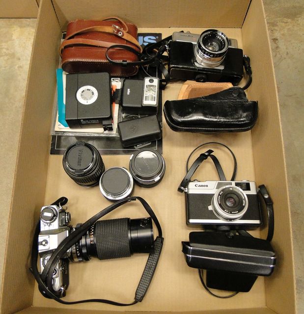Parti kameror och objetiv bl.a. Olympus OM 10 med objektiv 1:4.5 80-200mm