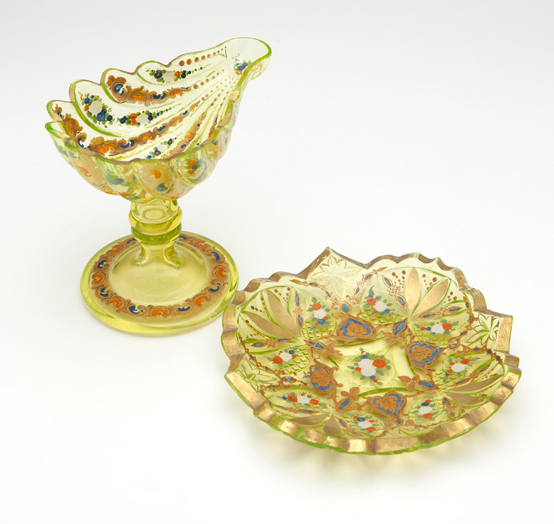 each of clear yellowish-green uranium/vaseline glass, hand-painted and gilt-highlighted with floral sprays, foliage and rocaille, comprising a footed shell-form compote (5.625'' H x 6.625'' W x 4.375'' D) and a scalloped-edge dish with wheel-cut moti