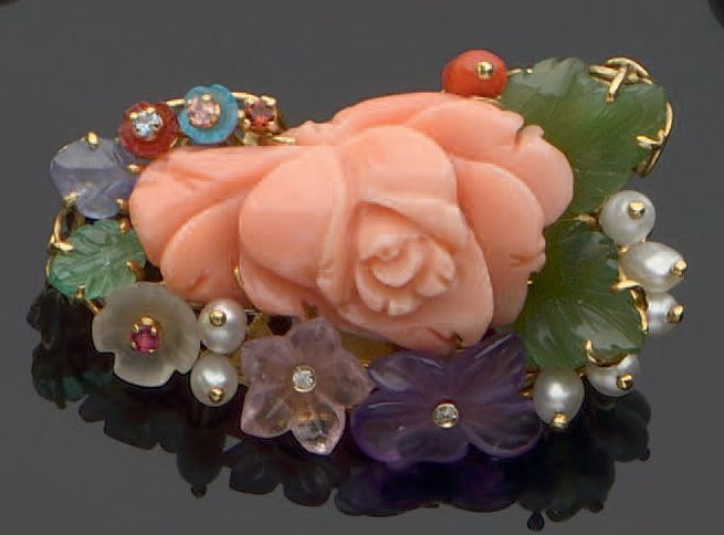 Pin centered in a natural coral pink flowers in a round of precious stones, precious and diamonds worn by yellow gold scrolls 75