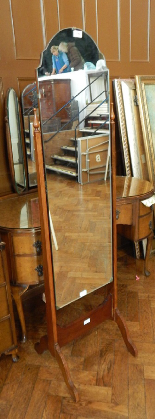 Plate glass cheval mirror with mahogany supports and splayed legs