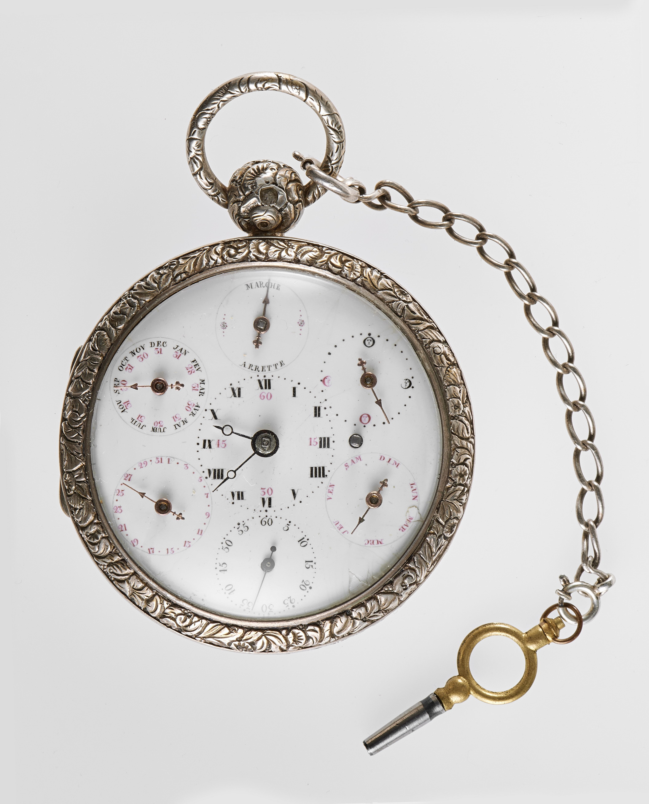 White enamelled dial, black and brass hands, black and red roman numerals, silver, D 65 mm