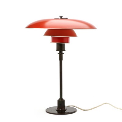 “PH-4/3". Table lamp with browned brass frame mrk. "Pat. Appl.” Thick switch house with later push-button switch. Shades red/white metal. Frame manufactured 1927 by Louis Poulsen. H. 54 cm.